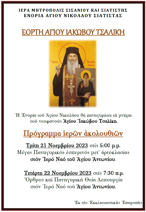 Ἡ Ἐνορία τοῦ Ἁγίου Νικολάου Σιάτιστας πανηγυρίζει τή μνήμη τοῦ νεοφανοῦς Ἁγίου Ἰακώβου Τσαλίκη.