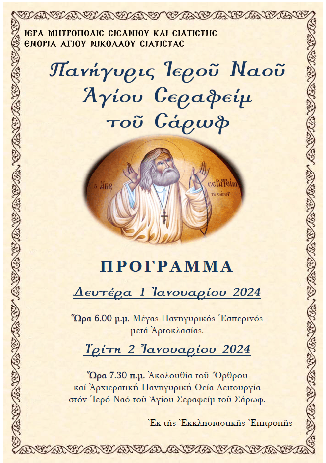 Πανήγυρις Ἱεροῦ Ναοῦ Ἁγίου Σεραφείμ τοῦ Σάρωφ.