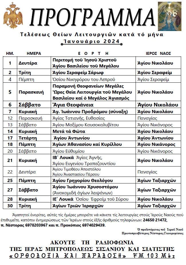 Πρόγραμμα Θείων Λειτουργιών Ιανουαρίου 2024