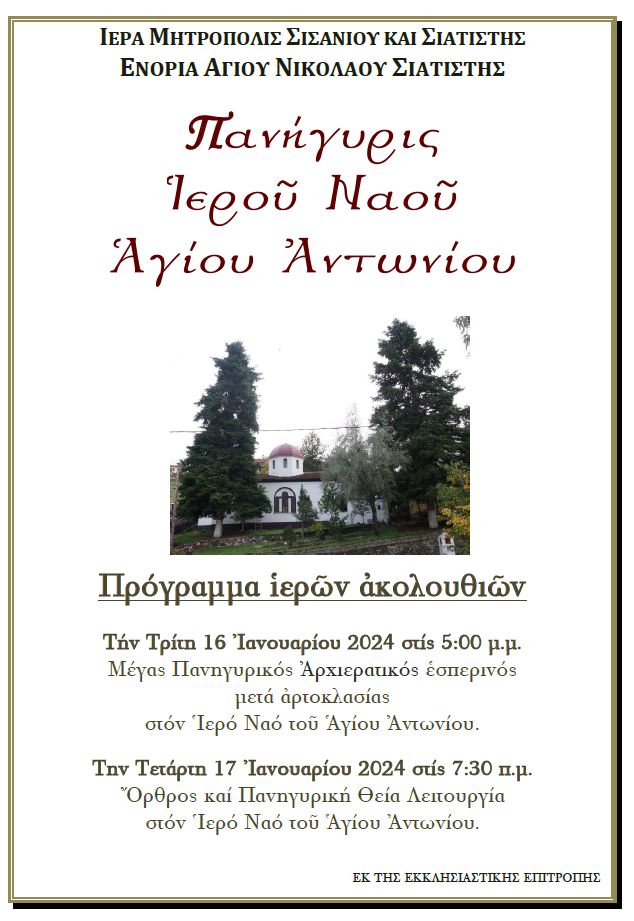 Πανηγυρίζει ο Ιερός Ναός του Αγίου Αντωνίου στη Σιάτιστα.