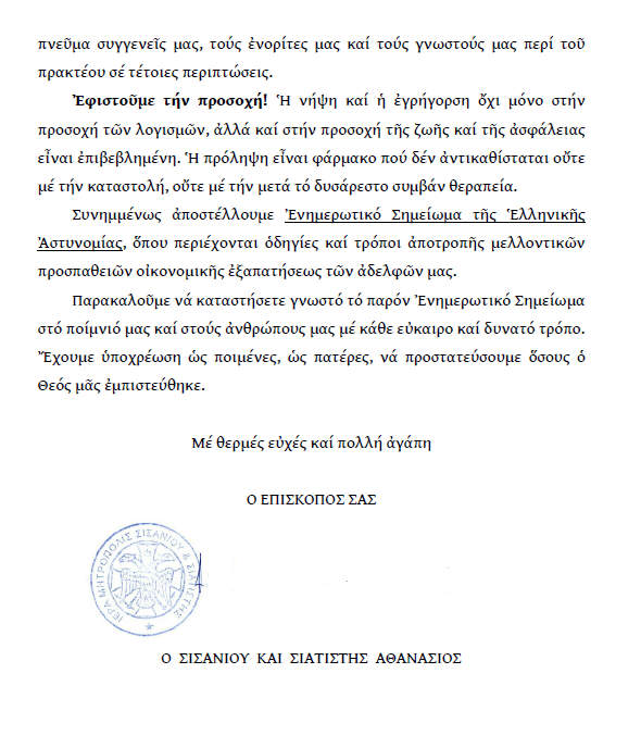 Ἐγκύκλιος τοῦ Σεβασμιωτάτου Μητροπολίτου Σισανίου καί Σιατίστης κ.κ. Ἀθανασίου.