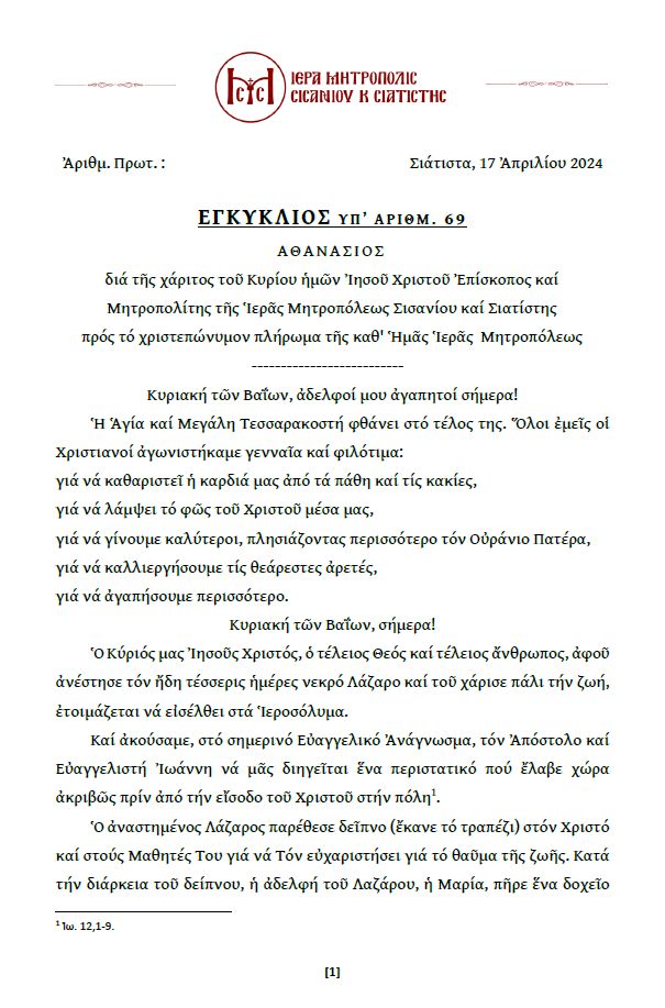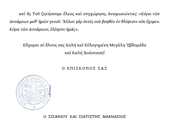 • Ἐγκύκλιος τοῦ Σεβασμιωτάτου Μητροπολίτου Σισανίου καί Σιατίστης κ.κ. Ἀθανασίου.