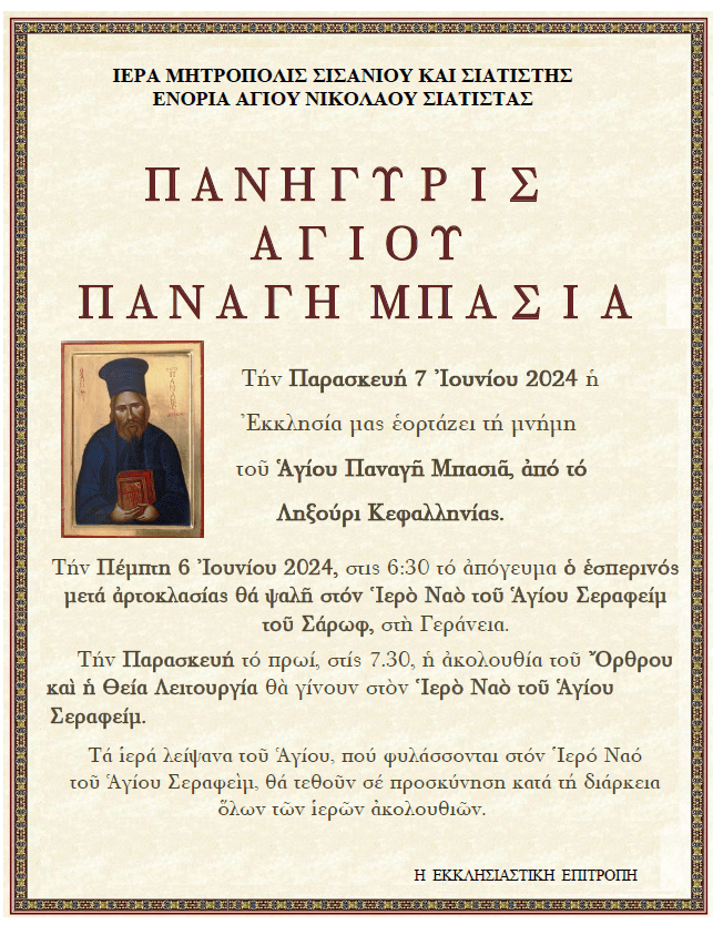 Εορτή Αγίου Παναγή Μπασιά από το Ληξούρι Κεφαλληνίας στην Ενορία του Αγίου Νικολάου Σιάτιστας.