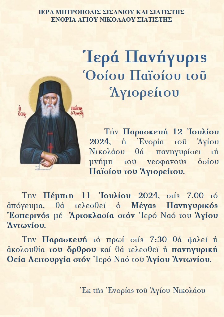 Ἱερά Πανήγυρις Ὁσίου Παϊσίου τοῦ Ἁγιορείτου στήν Ἐνορία τοῦ Ἁγίου Νικολάου Σιάτιστας.