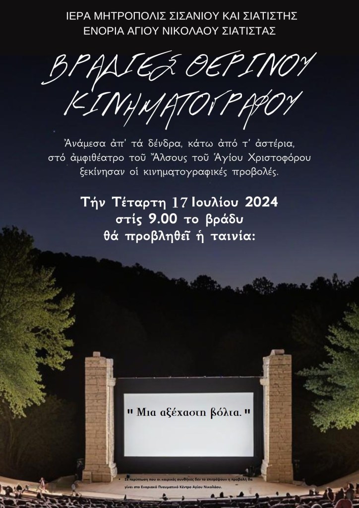 Βραδιά θερινοῦ κινηματογράφου… Τετάρτη 17 Ἰουλίου 2024