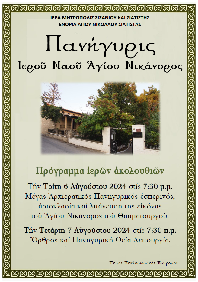 Πανήγυρις του κοιμητηριακού Ιερού Ναού Αγίου Νικάνορος στην ενορία του Αγίου Νικολάου Σιάτιστας.
