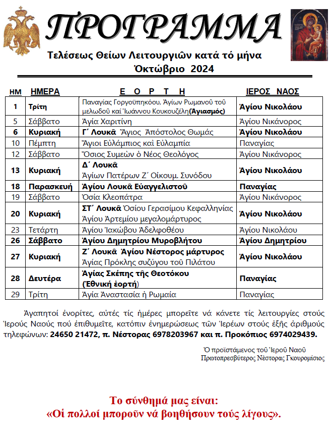 Πρόγραμμα Θείων Λειτουργιών Οκτωβρίου 2024
