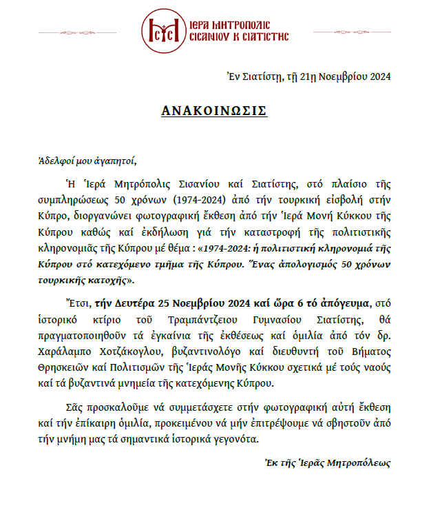 Ἐκδήλωση γιὰ τὰ 50 χρόνια συμπληρώσεως ἀπὸ τὴν τουρκικὴ εἰσβολὴ στὴν Κύπρο. (1974 – 2024)