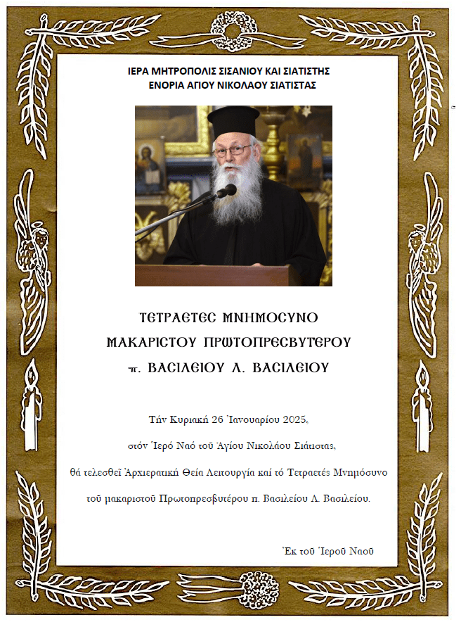 Τετραετές μνημόσυνο ὑπέρ ἀναπαύσεως τῆς ψυχῆς τοῦ μακαριστοῦ Πρωτοπρεσβυτέρου π. Βασιλείου Λ. Βασιλείου.