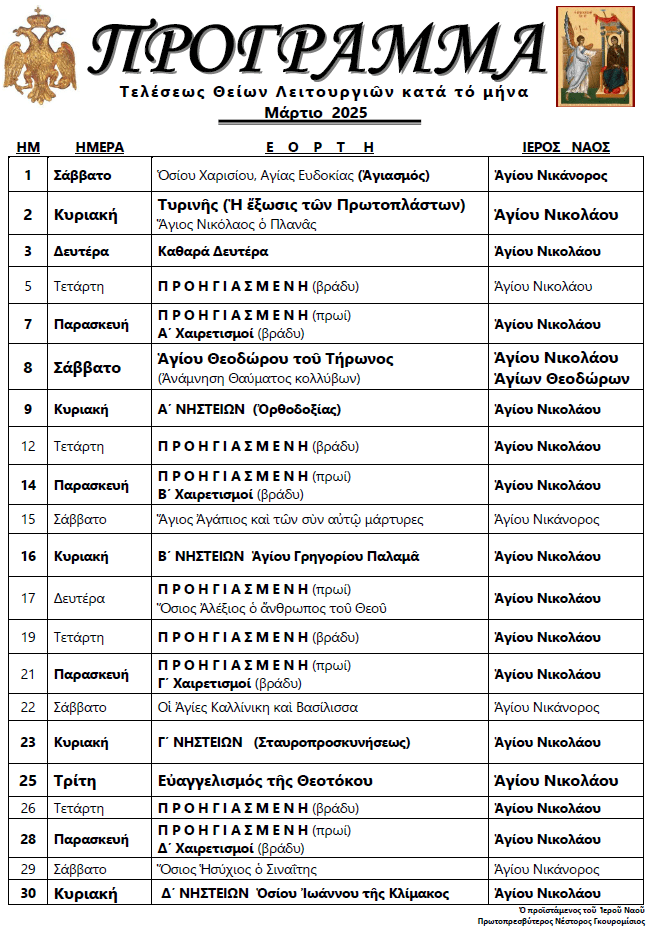 Πρόγραμμα Θείων Λειτουργιών Μαρτίου 2025