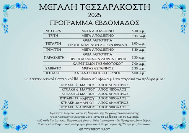Πρόγραμμα Ἐκκλησιαστικῶν Ἀκολουθιῶν καί Ὁμιλιῶν Μεγάλης Τεσσαρακοστῆς 2025.
