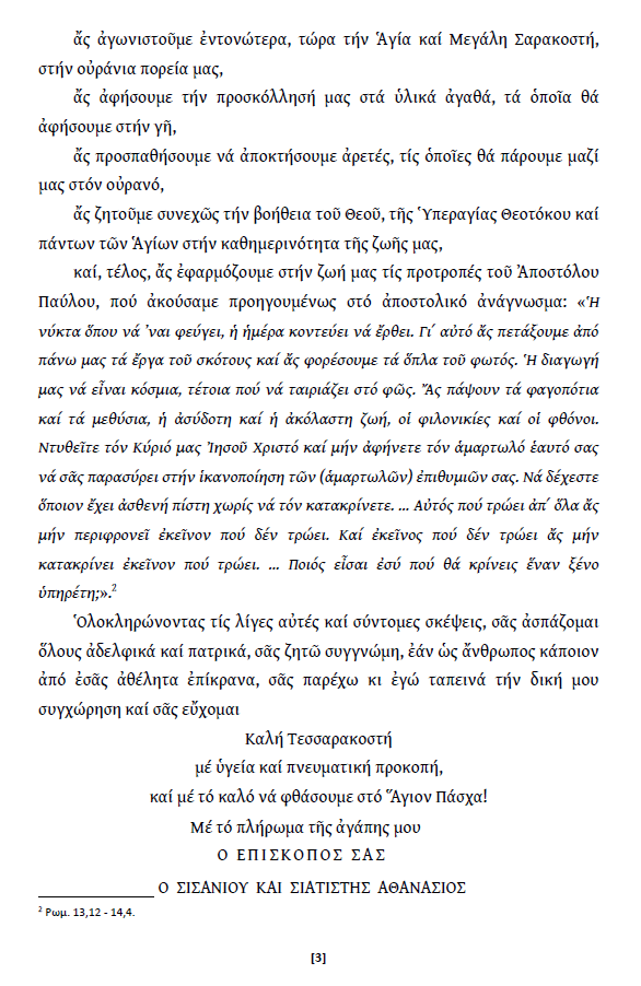 Ἐγκύκλιος τοῦ Σεβασμιωτάτου Μητροπολίτου Σισανίου καί Σιατίστης κ.κ. Ἀθανασίου.
