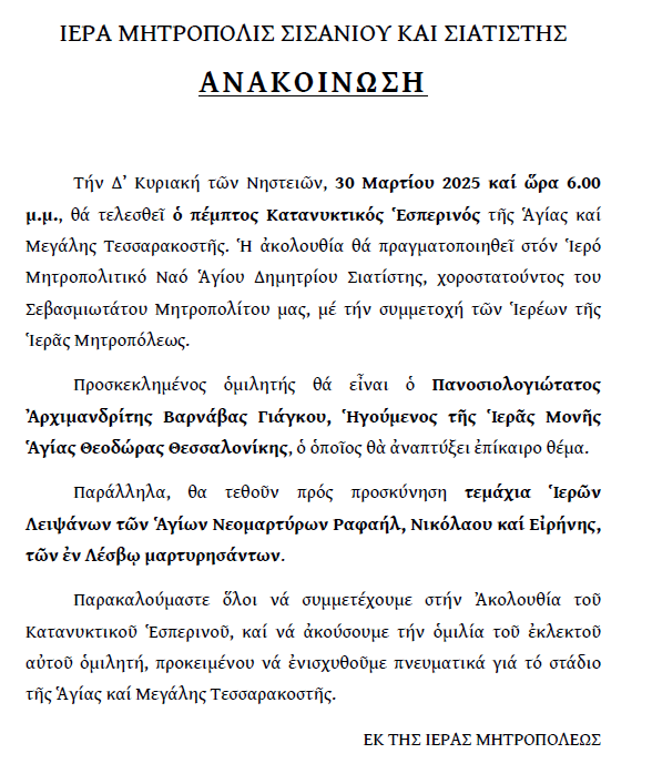 Ὁ Ε΄ Κατανυκτικὸς Ἑσπερινὸς στὸν Ἱερὸ Μητροπολιτικὸ Ναὸ Ἁγίου Δημητρίου Σιάτιστας.
