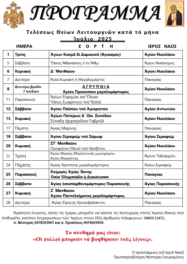 Πρόγραμμα Θείων Λειτουργιών Ιουλίου 2025
