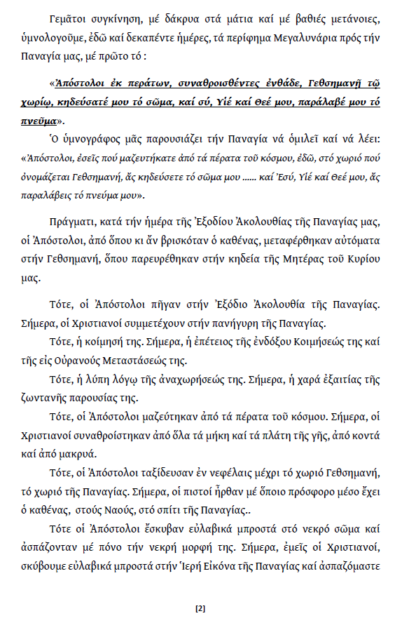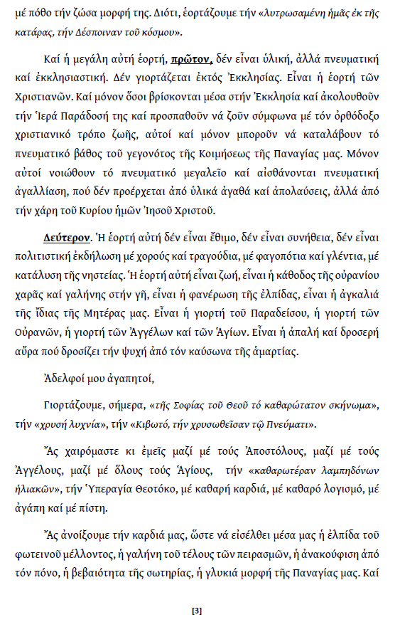 Ἐγκύκλιος ἐπί τῇ Θεομητορική ἑορτή τῆς Κοιμήσεως τῆς Ὑπεραγίας Θεοτόκου.