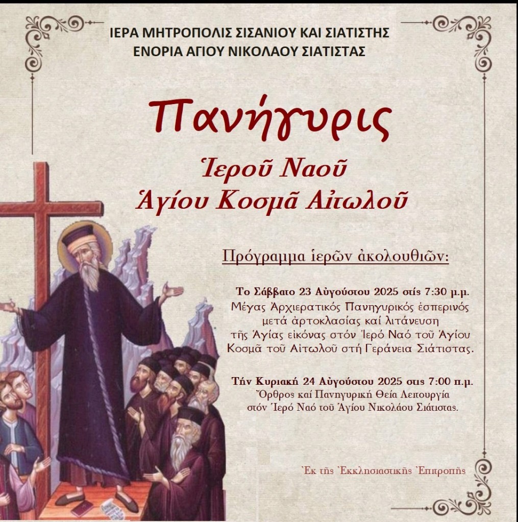 Πανήγυρις Ιερού Ναού Αγίου Κοσμά Αιτωλού Σιάτιστας.