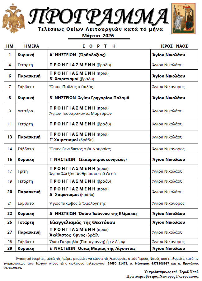 Πρόγραμμα Θείων Λειτουργιών Μαρτίου 2026.