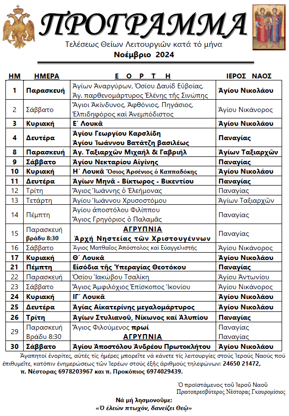 Πρόγραμμα Θείων Λειτουργιών Νοεμβρίου 2024