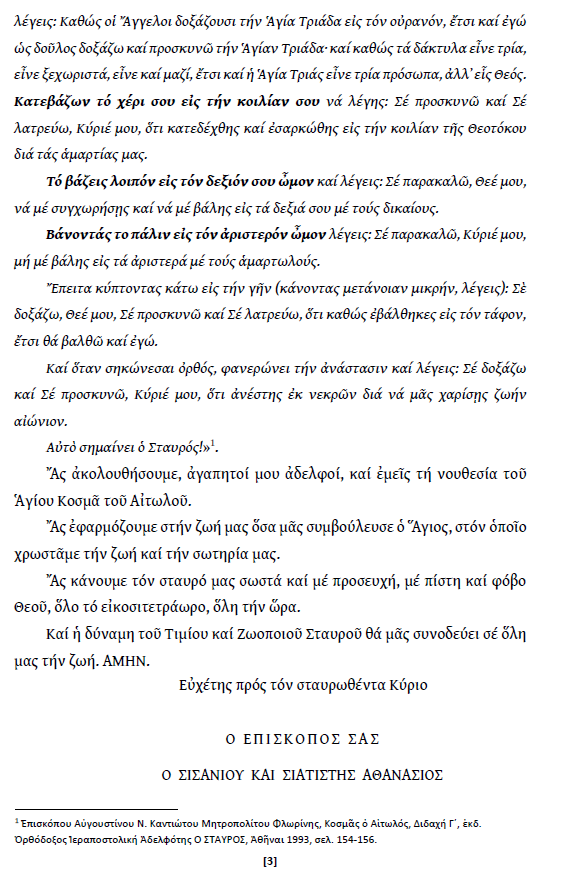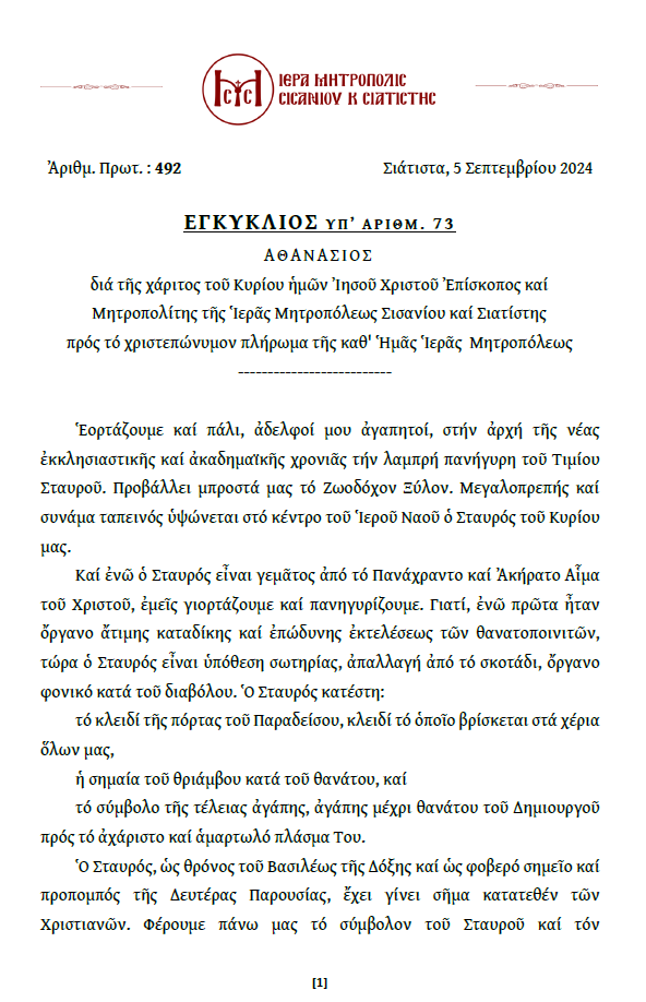 Ἐγκύκλιος ἐπὶ τῇ ἑορτὴ τῆς Ὑψώσεως τοῦ Τιμίου καὶ Ζωοποιοῦ Σταυροῦ τοῦ Σεβασμιωτάτου Μητροπολίτου Σισανίου καὶ Σιατίστης κ.κ. Ἀθανασίου.