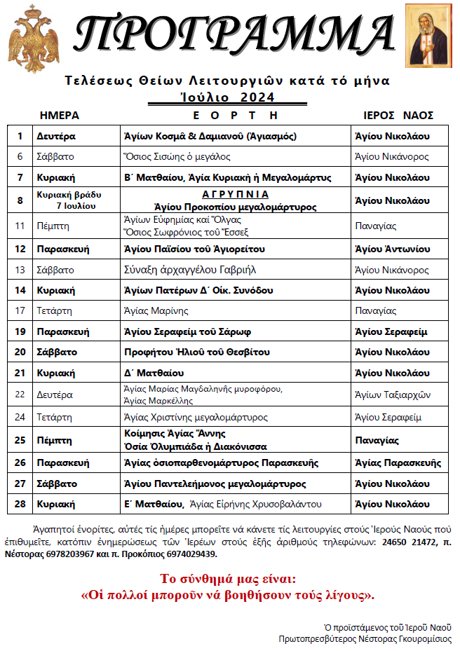 Πρόγραμμα Θείων Λειτουργιών Ιουλίου 2024