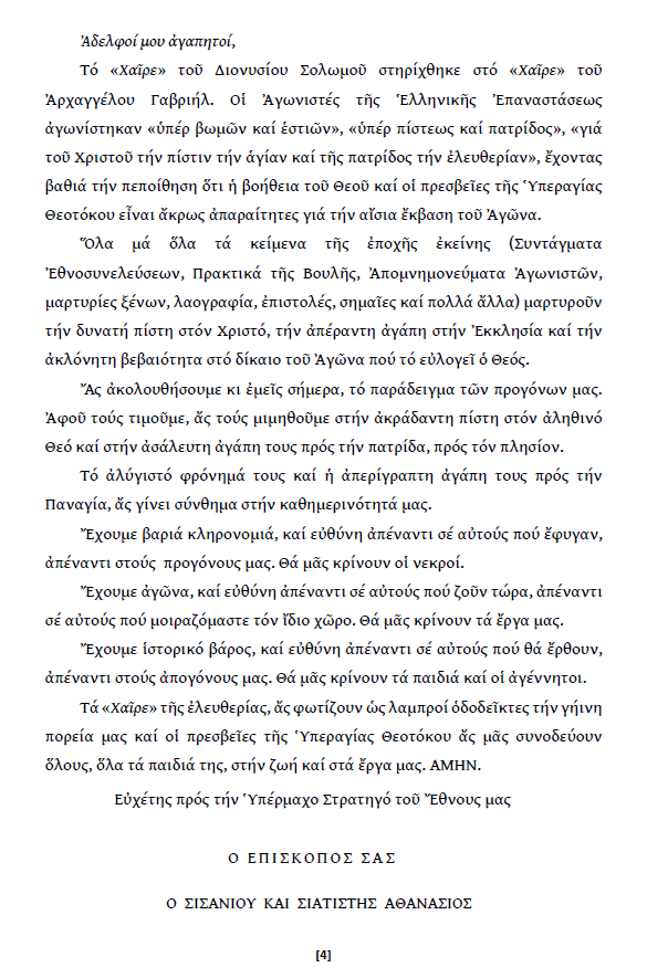 Το θέμα της φετινής εορτής ήταν η εθνική και πάνδειμη συμμετοχή στην Επανάσταση του ’21. Όλος ο ελληνισμός, κλήρος και λαός, πλούσιοι και φτωχοί κάτοικοι της υπαίθρου και των νησιών, άνδρες και γυναίκες, νέοι, γέροι και παιδιά πολέμησαν για του «Χριστού την πίστη την Αγία και της πατρίδος της ελευθερία».
