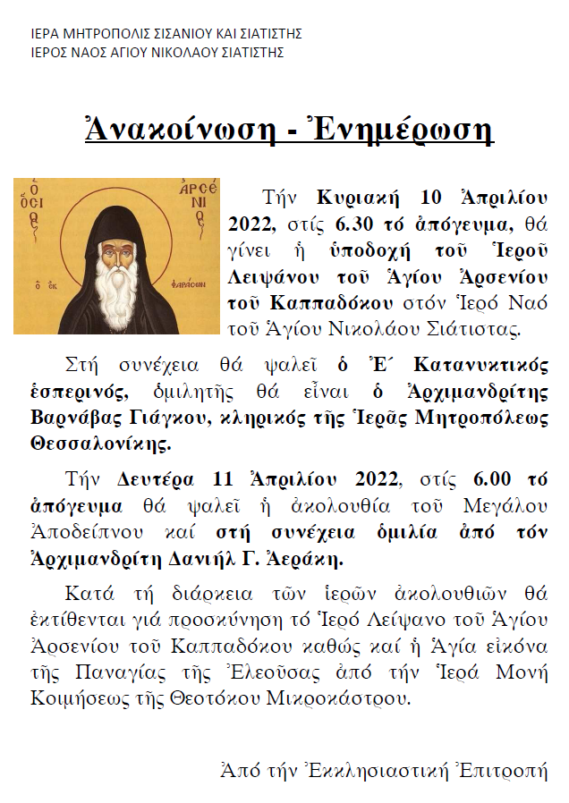 Με την παρουσία πιστών και κληρικών πραγματοποιήθηκε το απόγευμα της Κυριακής 10 Απριλίου 2022, στον Ιερό Ναό Αγίου Νικολάου Σιάτιστας η υποδοχή του Ιερού Λειψάνου του Αγίου Αρσενίου του Καππαδόκου.