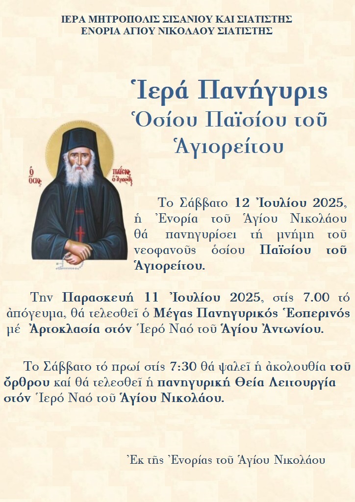Ἱερά Πανήγυρις Ὁσίου Παϊσίου τοῦ Ἁγιορείτου στήν Ἐνορία τοῦ Ἁγίου Νικολάου Σιάτιστας.
