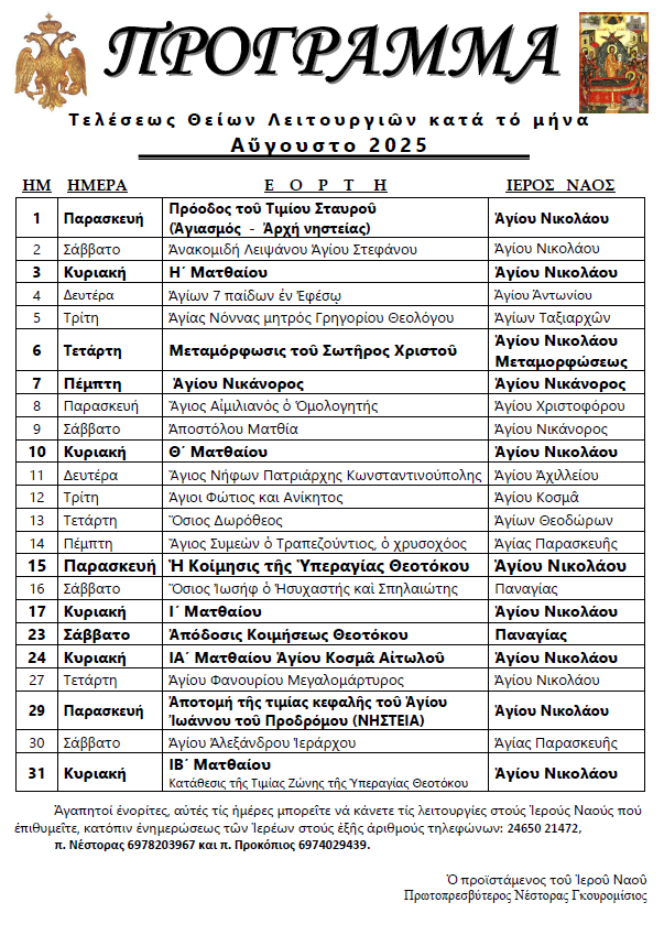 Πρόγραμμα Θείων Λειτουργιών Αυγούστου 2025