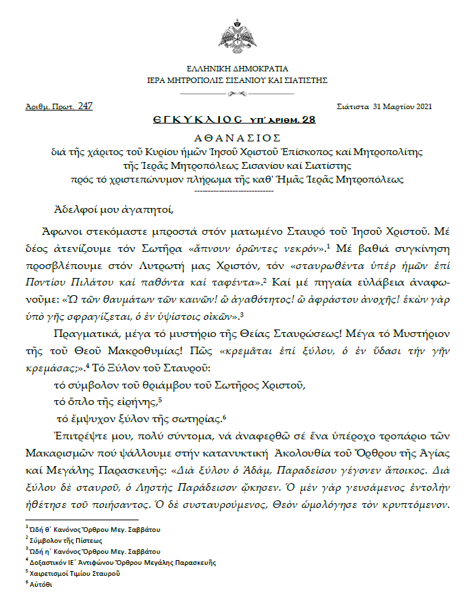 Εγκύκλιος του Σεβασμιωτάτου Μητροπολίτου Σισανίου και Σιατίστης κ.κ. Αθανασίου.