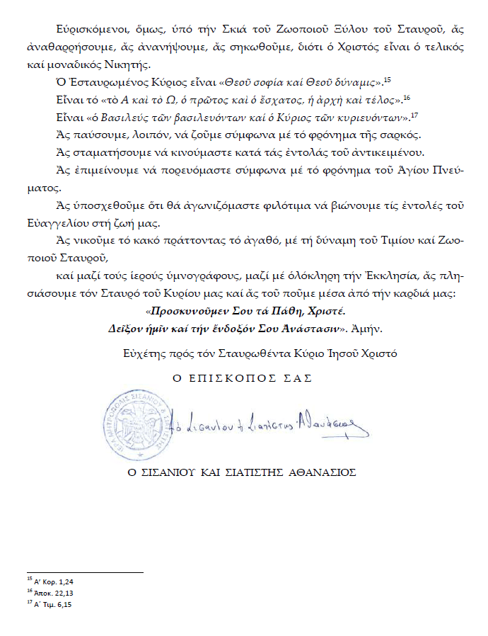 Ἐγκύκλιος ἐπί τῇ ἑορτῇ τῆς Ἀναστάσεως τοῦ Χριστοῦ τοῦ Σεβασμιωτάτου Μητροπολίτου Σισανίου καί Σιατίστης κ.κ. Ἀθανασίου.