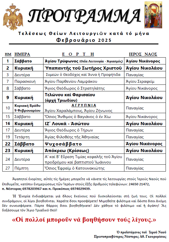 Μπροστά μας βρίσκεται ἡ κατανυκτικὴ περίοδος τοῦ ἐκκλησιαστικοῦ ἔτους, ἡ μεγάλη Τεσσαρακοστή. Ἂς νυγοῦμε λίγο ἀπό τὰ τροπάρια, ἀπό τά ἀναγνώσματα, ἀπό τοὺς λόγους τῶν ἁγίων Πατέρων τῆς Ἐκκλησίας μας, καὶ ἂς ἀλλάξουμε τὴν διεστραμμένη πορεία τῆς ζωῆς μας.